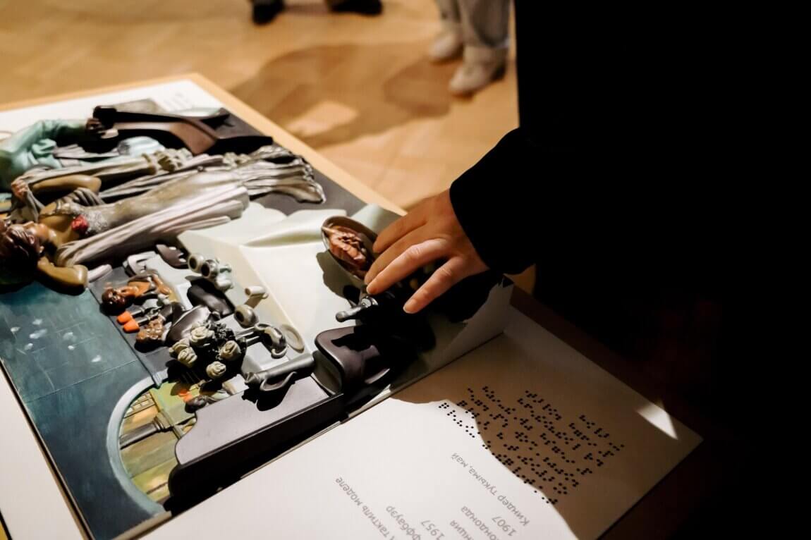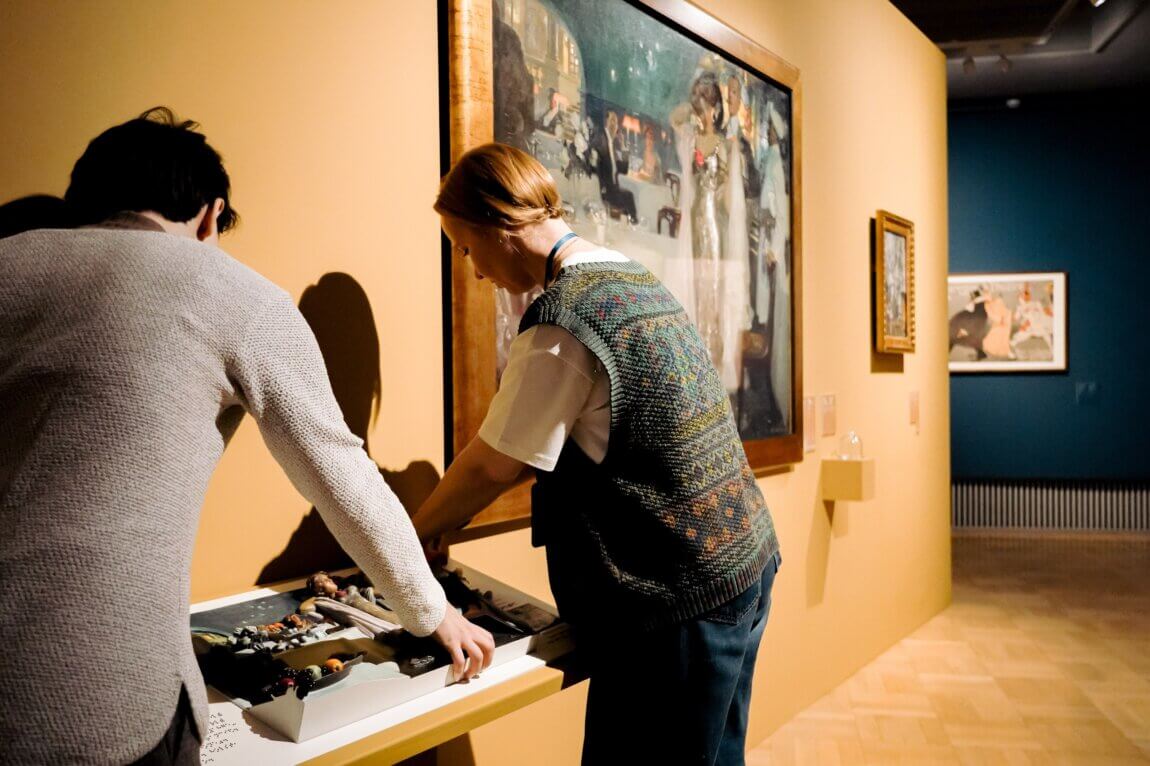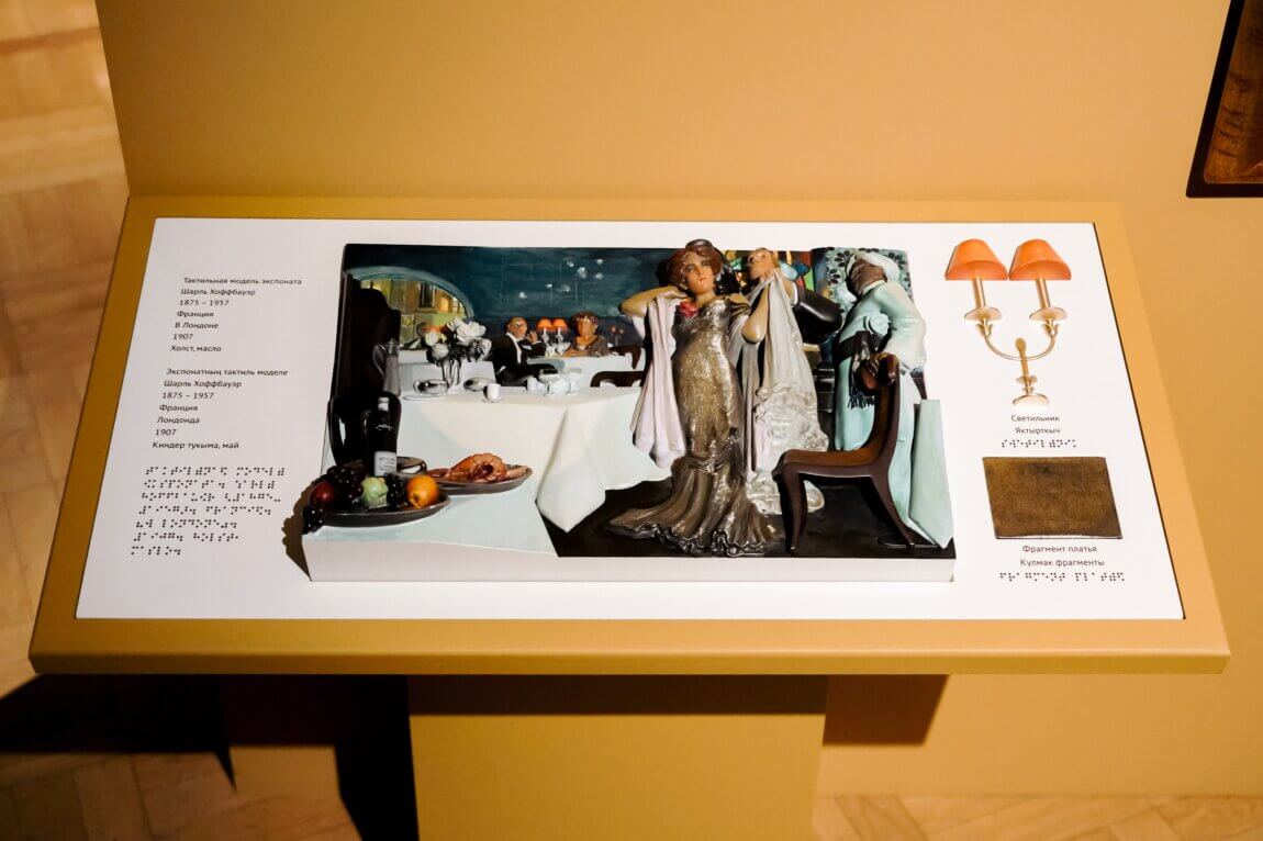 Центр «Эрмитаж-Казань»На выставке «Прекрасная эпоха. Европейское искусство рубежа XIX–XX вв.» в Центре «Эрмитаж-Казань» установили новую тактильную станцию. Она в деталях повторяет картину Шарля Хоффбауэра «В Лондоне», позволяя подробно «рассмотреть» предметы, понять их фактуру и особенности.