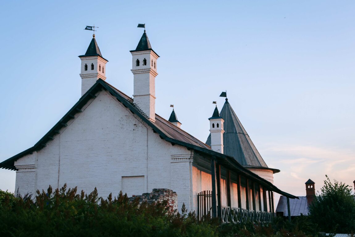 Здание покрыто деревянной тесовой кровлей с полицами (нижняя пологая часть крыши, отводящая дождевые воды от стен). На кровлю выходят высокие кирпичные трубы с утолщениями на конце, накрыты островерхими колпаками, завершенные флюгерами в виде прапоров (металлический флажок).