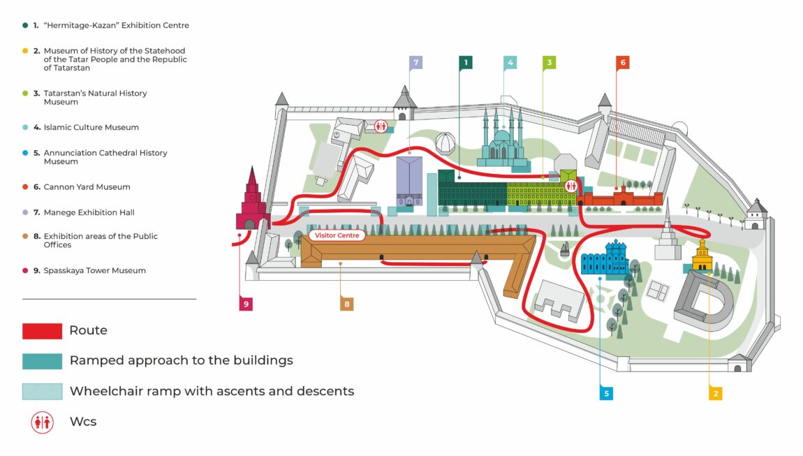This map displays museums and exhibition halls, ramps, ascents and descents, and accessible WCs. Due to historical peculiarities, the conditions for people with different disabilities visiting our sites will differ.
