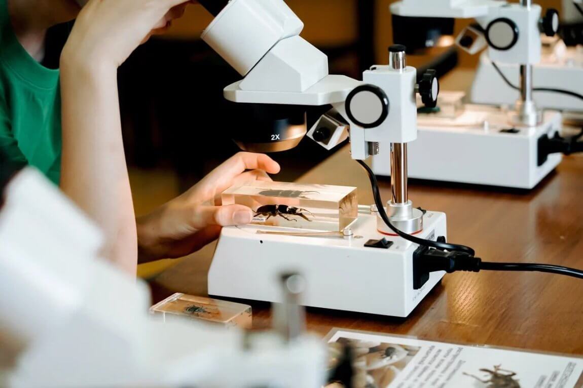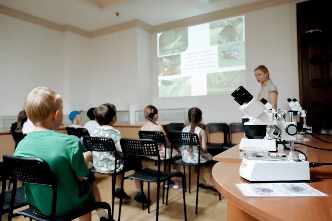В начале занятия ведущий вместе с детьми вспоминает, кто такие насекомые, их основные признаки и конкретных представителей – жуков.  Участникам расскажут о самых «выдающихся» жуках, приведут интересные факты, сопровождая рассказ красочной презентацией, а также предложат познакомиться с коллекцией современных жуков, законсервированных в синтетической смоле. Ведущий объяснит, как устроен бинокулярный микроскоп, как им пользоваться.