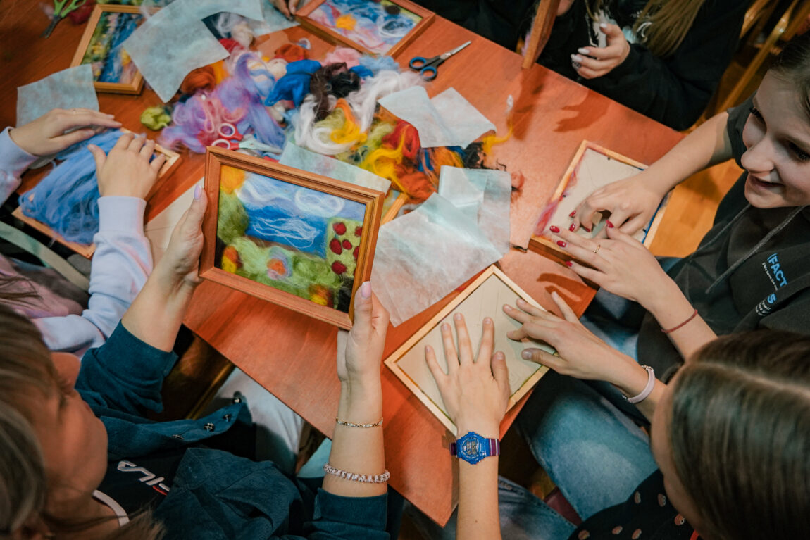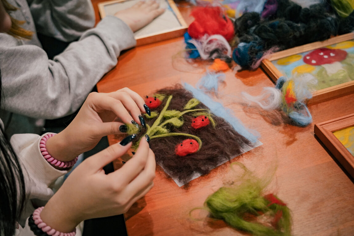 Не используя кисточек, красок и воды, методом послойного выкладывания цветной овечьей шерсти каждый сможет сделать свою теплую, мягкую и очень уютную картину. Сюжеты картины могут быть самыми разными: пейзажи, герои мультфильмов, цветы, животные и многое другое. Готовая работа оформляется в раму со стеклом.