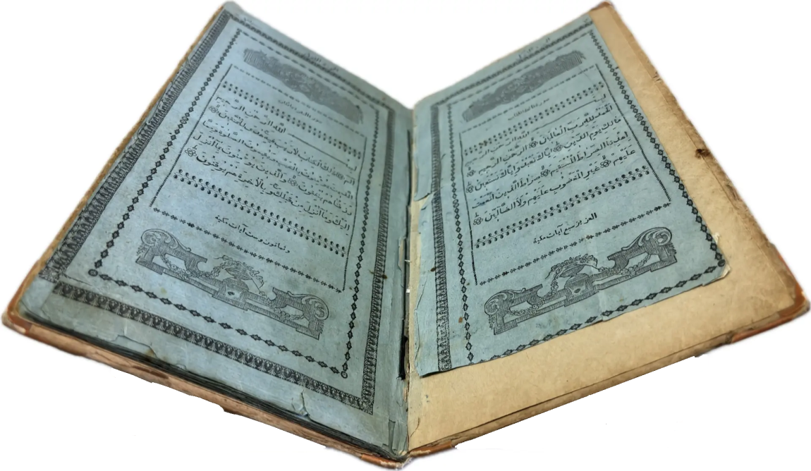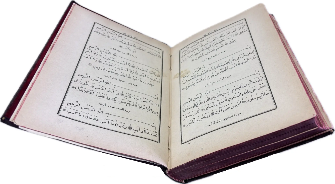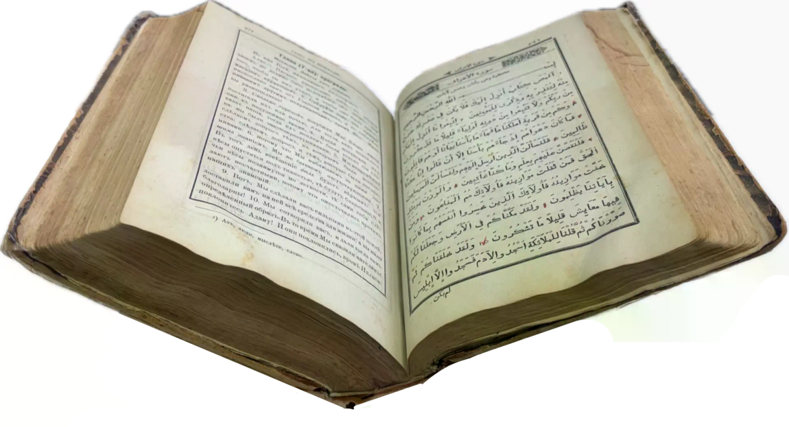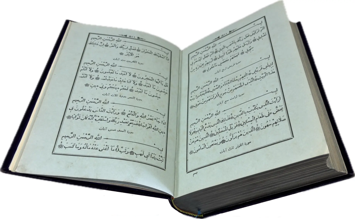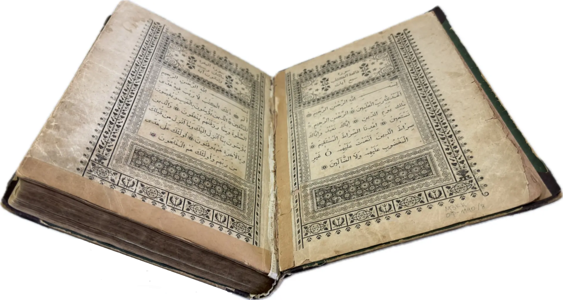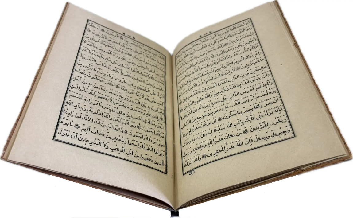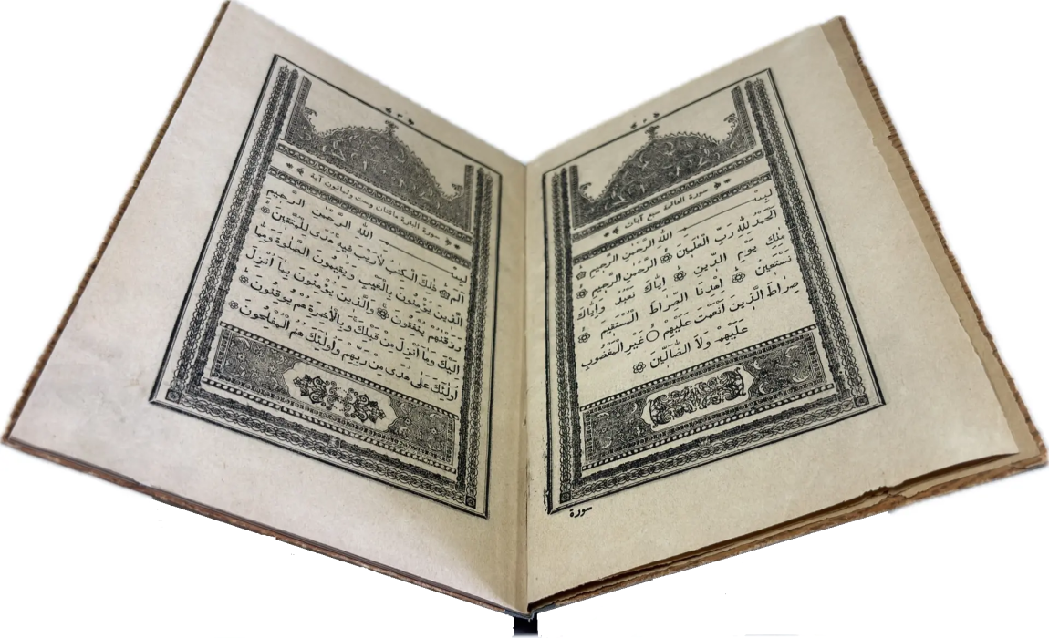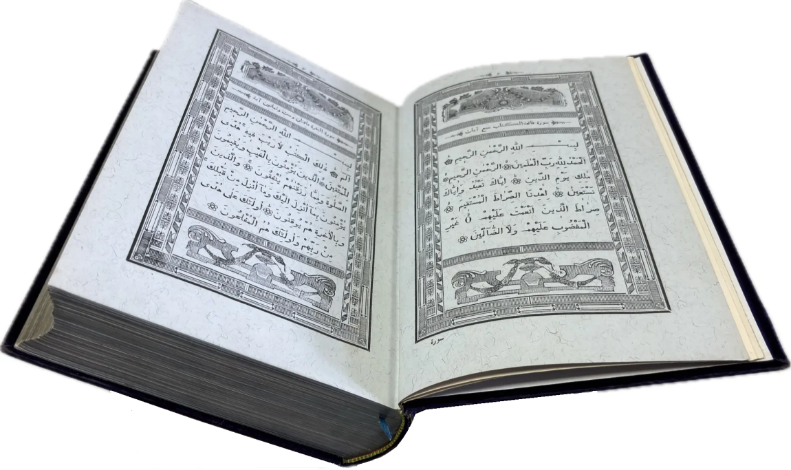Перед вами Коран, вышедший в типографии Ивана Николаевича Харитонова, которого называли татарским Гутенбергом за высокое качество печати, совершенствование арабских шрифтов и художественное оформление изданий. Также изданием Корана в Казани в разные годы занимались типографии Императорской Казанской гимназии и Императорского Казанского университета, Н.П. Коковина, С.М. и М.А. Чирковых, Л. Шевица, Г.М. Вечеслава, Б.Л. Домбровского, братьев Каримовых, И.Н. Харитонова, «Умид» и др.