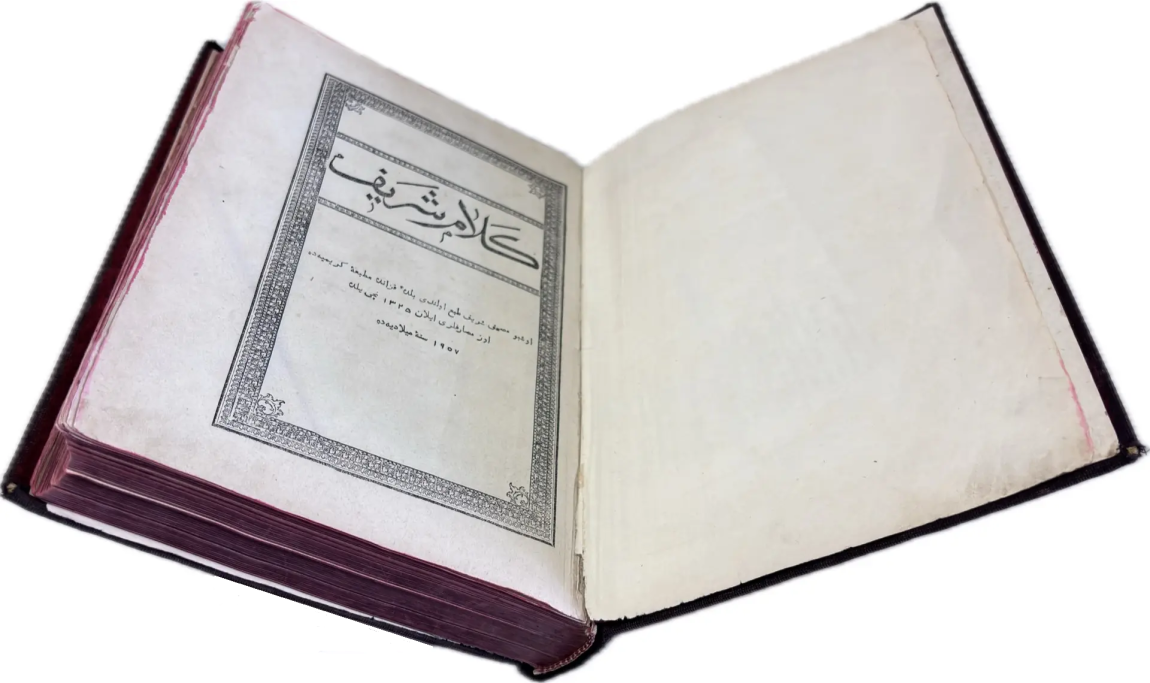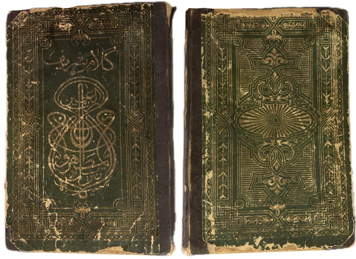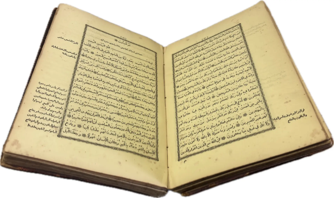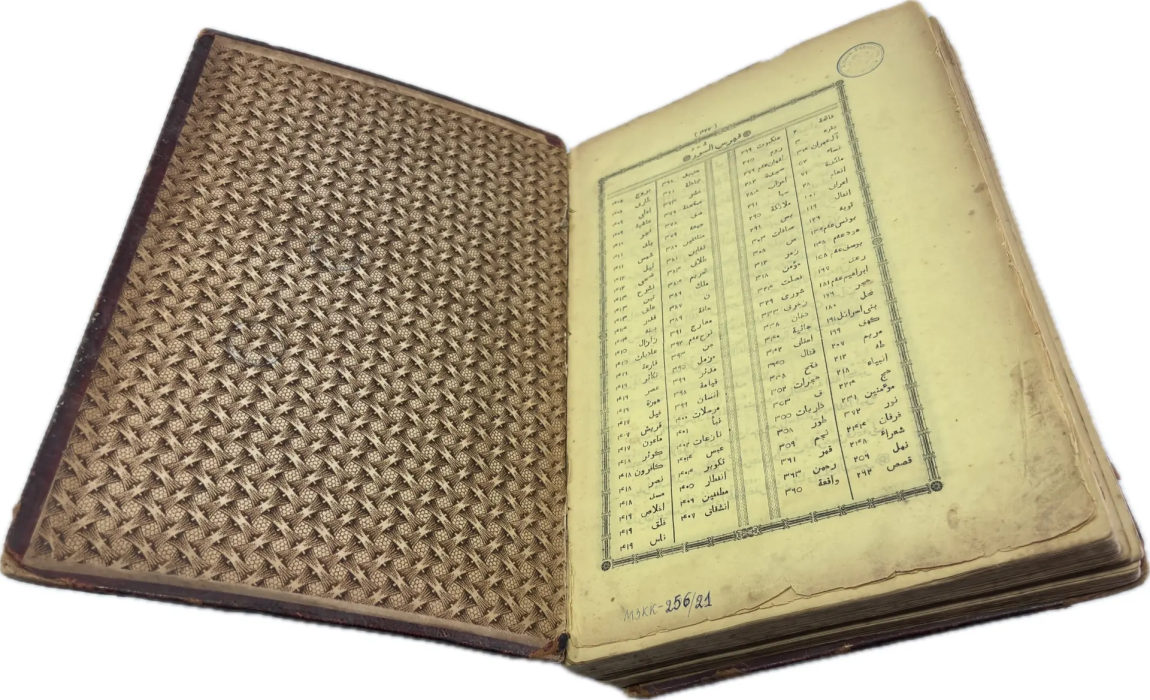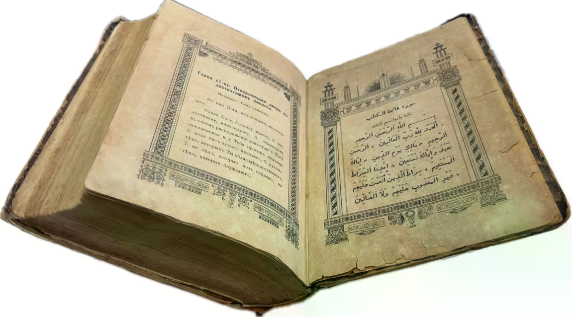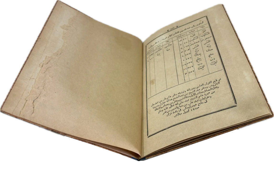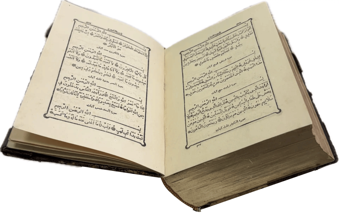 Перед вами Коран, вышедший в типографии Ивана Николаевича Харитонова, которого называли татарским Гутенбергом за высокое качество печати, совершенствование арабских шрифтов и художественное оформление изданий. Также изданием Корана в Казани в разные годы занимались типографии Императорской Казанской гимназии и Императорского Казанского университета, Н.П. Коковина, С.М. и М.А. Чирковых, Л. Шевица, Г.М. Вечеслава, Б.Л. Домбровского, братьев Каримовых, И.Н. Харитонова, «Умид» и др.