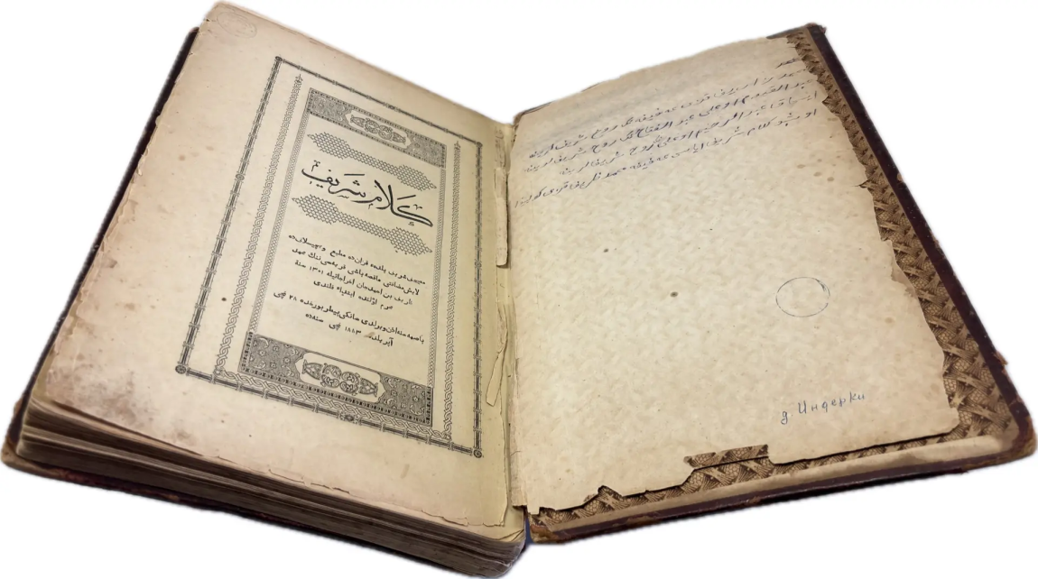 Переплет кожаный с тиснением. Есть запись чернилами на татарском языке в арабской графике о принадлежности книги усопшей Гафифе дочери Мухаммад-Зарифа Кулиевой.