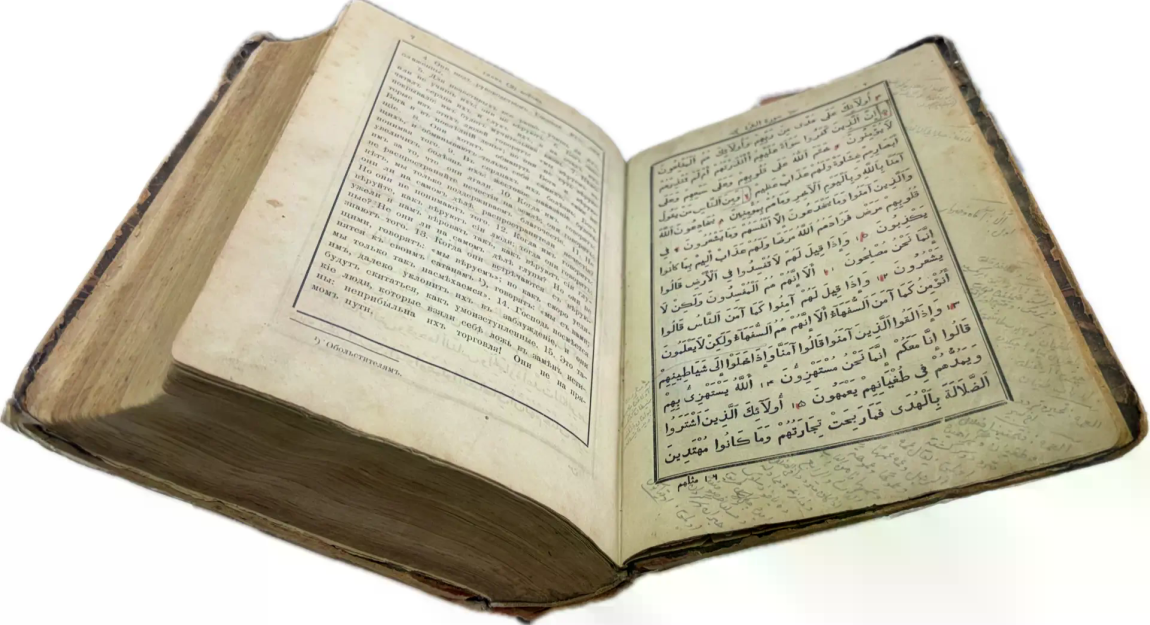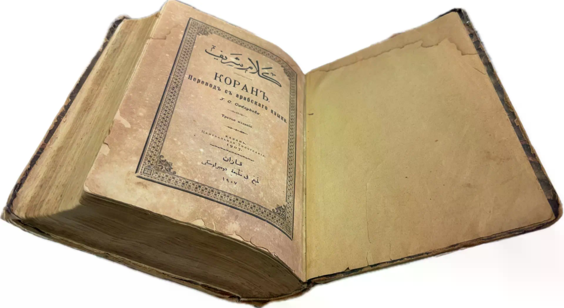 Перед вами – перевод Корана на русский язык, выполненный профессором Казанской духовной академии Г. С. Саблуковым (1804-1880). Книжный блок ориентирован по-мусульмански справа налево и сочетает арабский текст Корана (правая страница каждого разворота) и перевод на русский язык (левая страница каждого разворота). Первый тираж этого перевода вышел в 1878 году в Казани. Перевод оценивается как адекватный смыслам Корана, так как был выполнен непосредственно с арабского текста, а не с третьих языков. Интересная особенность настоящего перевода Саблукова –  это отсутствие арабизмов в тексте, поэтому он понятен тем, кто не знаком с исламской традицией и терминологией. Это издание сочетает в себе казанский набор Корана с переводом смыслов на русский язык.