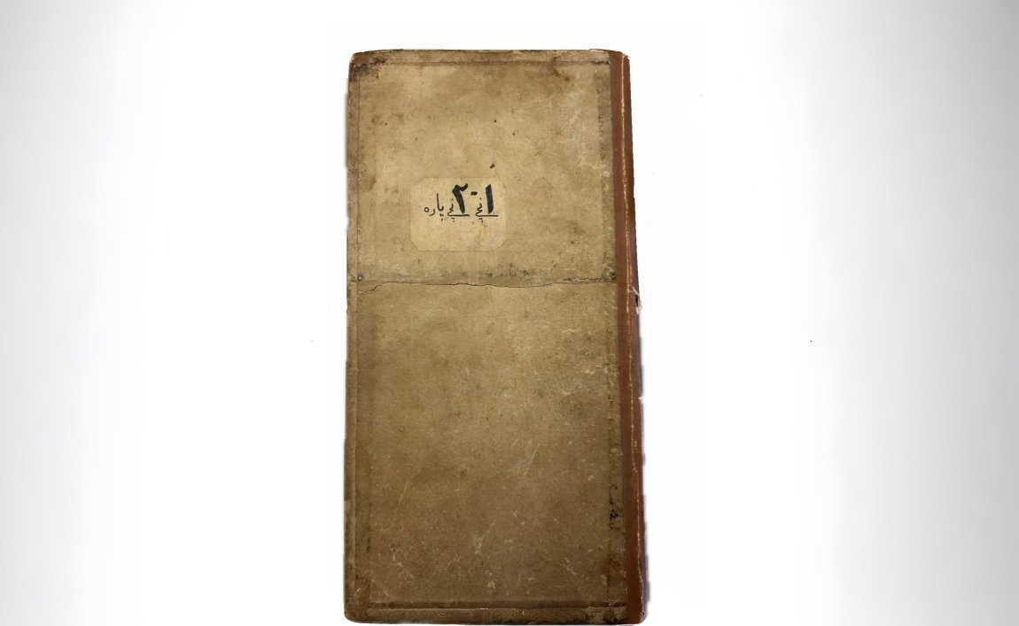 Первоначально Коран вышел одним томом объемом почти в 500 страниц. Позже издание было поделено владельцем на 15 равных частей (по 2 джуза в каждом). Перед вами первый том, содержащий 2 джуза, а именно суру аль-Фатиха и 252 аята суры аль-Бакара. Бумага мануфактурная, голубая. При перепрошивке владелец срезал комментарии на полях, то есть ту часть книги, которая находится за декоративной рамкой. Это показывает утилитарность, частоту обращения к Книге.