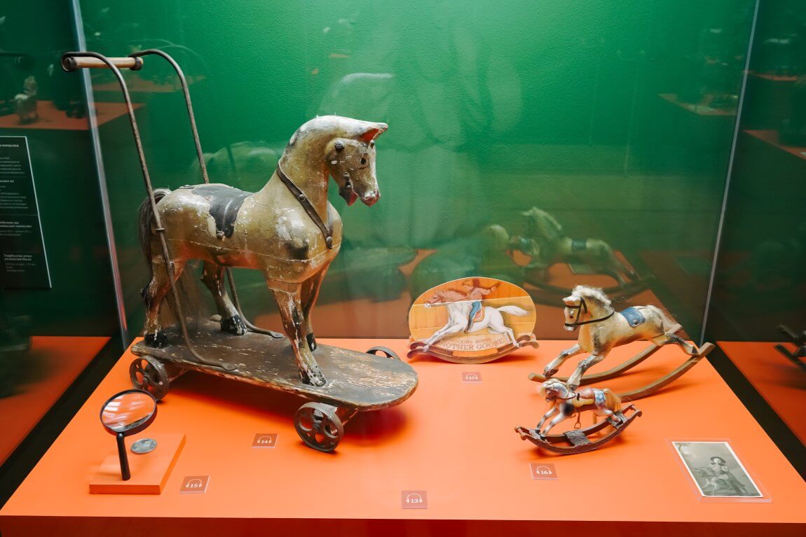 Эта выставка для взрослых и детей. Приобретая входной билет, каждый посетитель получает аудиогид, чтобы открыть трогательный мир этих игрушек. Для детей на выставке подготовлены тематические раскраски, а также возможность покататься на лошадке-качалке в зале.