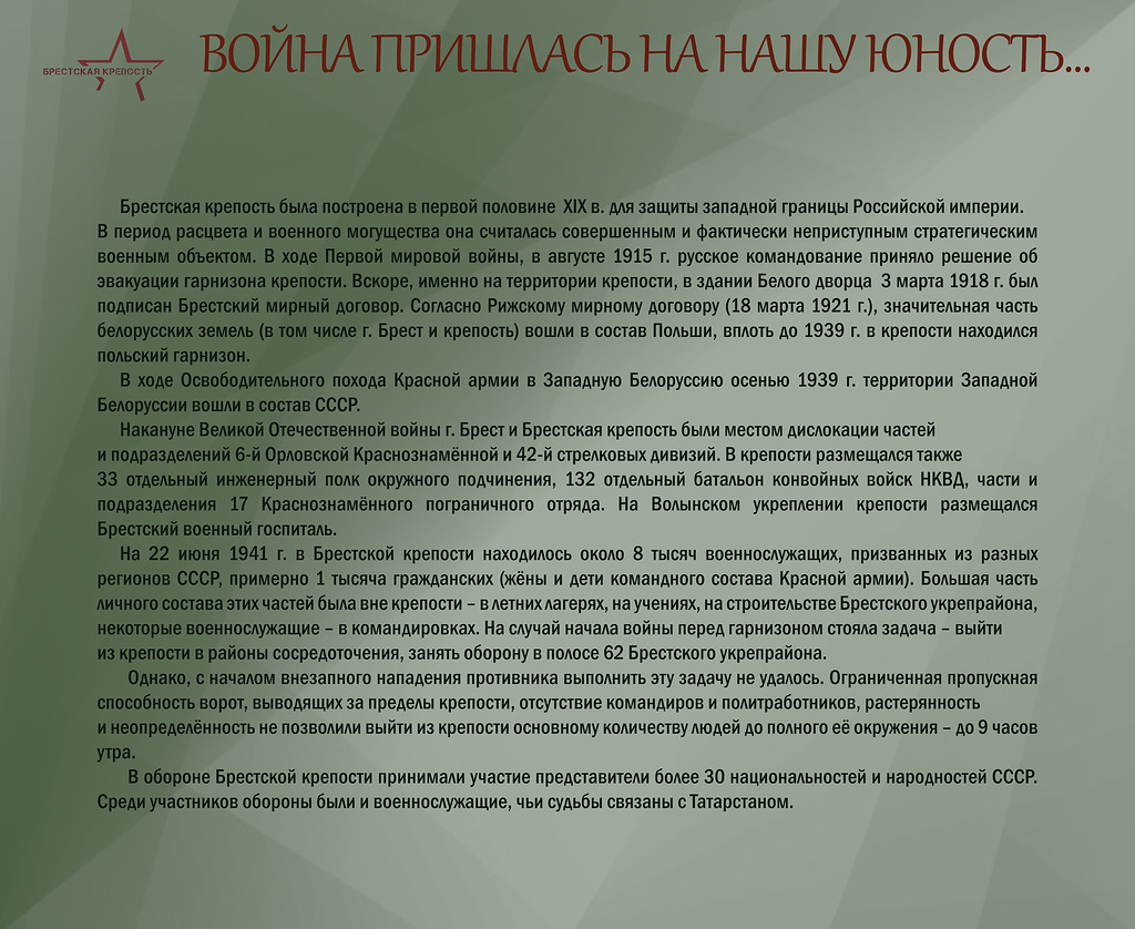 В обороне Брестской крепости в июне-июле 1941 г. принимали участие представители порядка 30 национальностей и народностей СССР. Среди участников обороны были и военнослужащие, чьи судьбы связаны с Татарстаном.