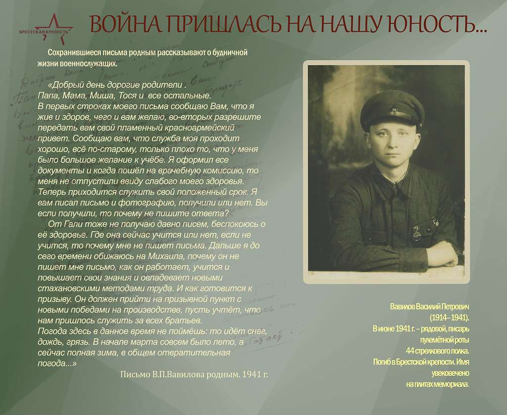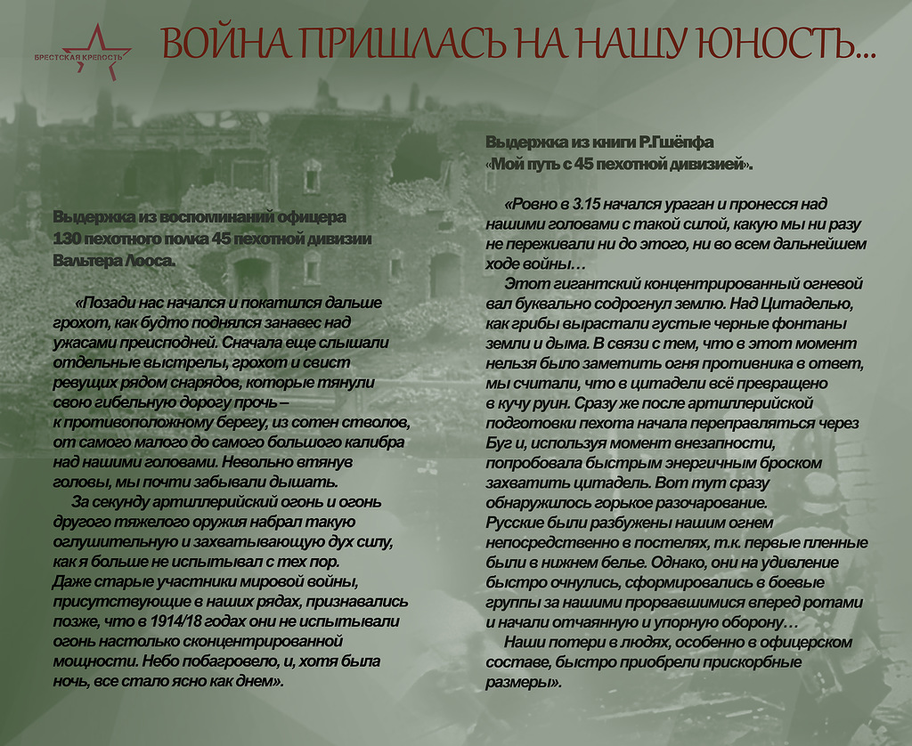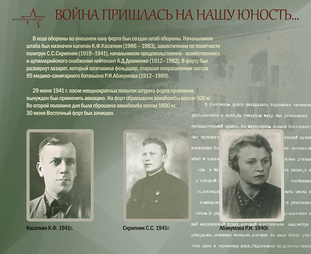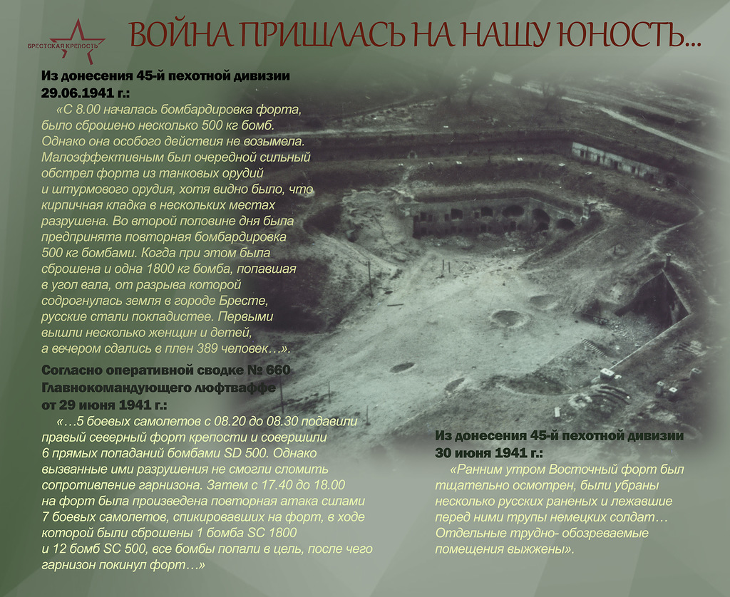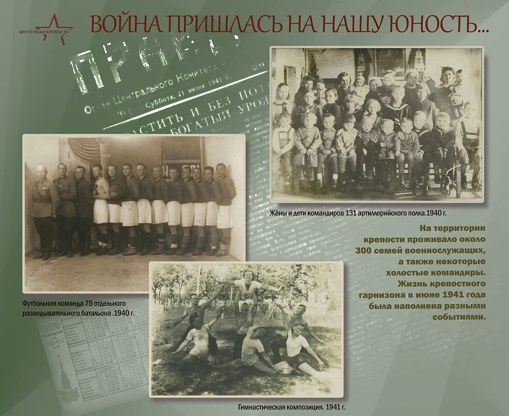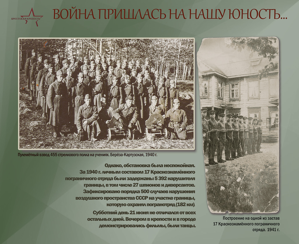 На 22 июня 1941 г. в Брестской крепости находилось около 8 тысяч военнослужащих, призванных из разных регионов СССР, примерно 1 тысяча гражданских (жены и дети командного состава Красной армии). Большая часть личного состава этих частей была вне крепости – в летних лагерях, на учениях, на строительстве Брестского укрепрайона, некоторые военнослужащие – в командировках. На случай начала войны перед гарнизоном стояла задача – выйти из крепости в районы сосредоточения, занять оборону в полосе 62 Брестского укрепрайона.