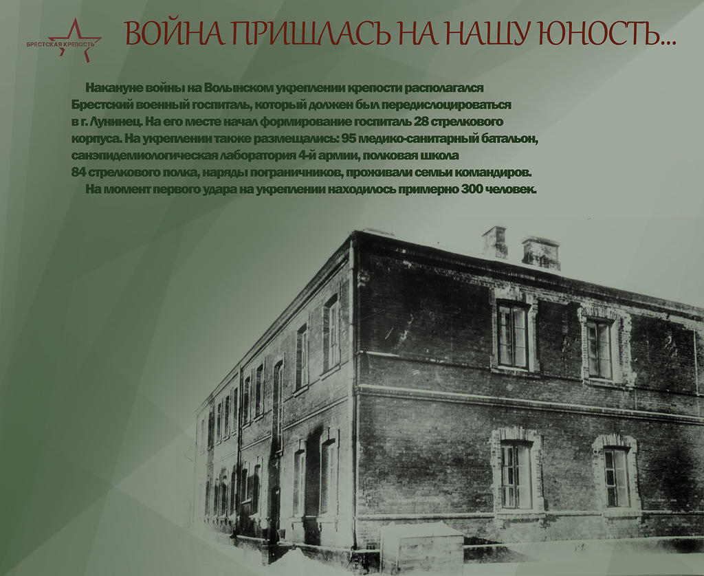 Накануне Великой Отечественной войны Брестская крепость была местом дислокации частей и подразделений 6-й Орловской Краснознаменной и 42-й стрелковых дивизий, а также 33 отдельный инженерный полк окружного подчинения, 132 отдельный батальон конвойных войск НКВД, 17 Краснознаменный пограничный отряд. На Волынском укреплении крепости размещался Брестский военный госпиталь.