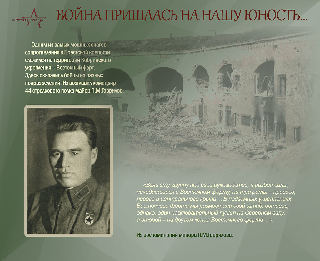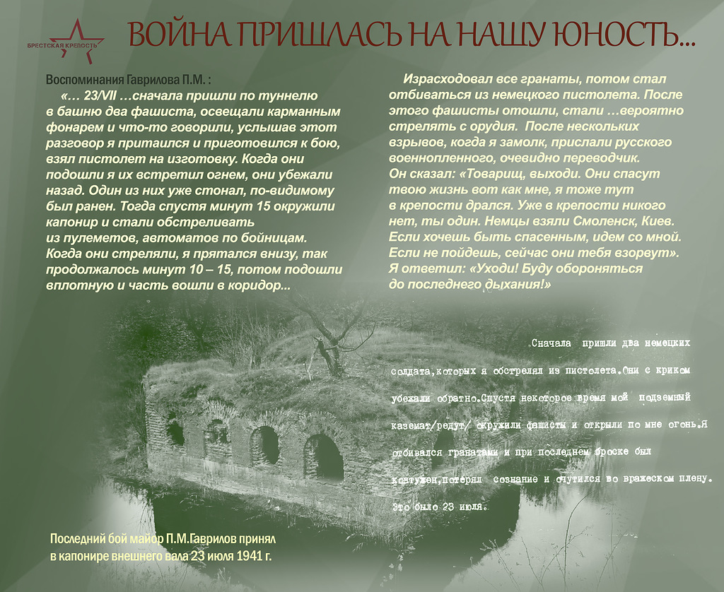 Последний известный защитник крепости – майор П.М.Гаврилов принял свой последний бой в капонире внешнего вала Кобринского укрепления 23 июля 1941 г.