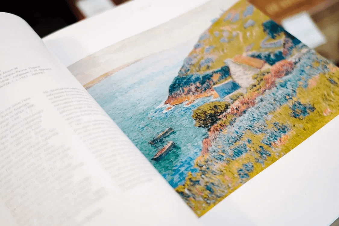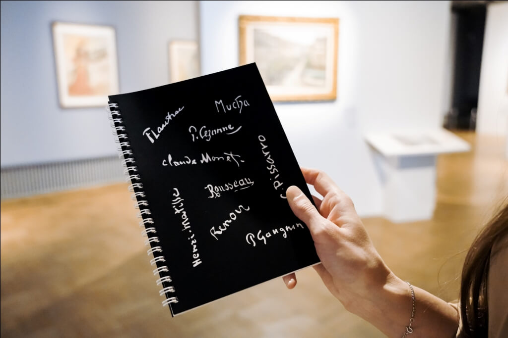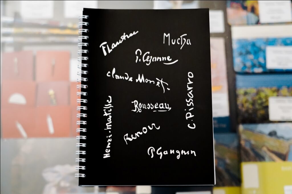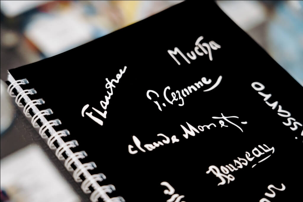 Черный блокнот с подписями и именами художников – Анри Руссо, Пьер Огюст Ренуар, Анри Тулуз-Лотрек, Анри Матисс, Альфонс Муха, Поль Гоген, Поль Сезанн, Камиль Писсарро и Клод Моне.