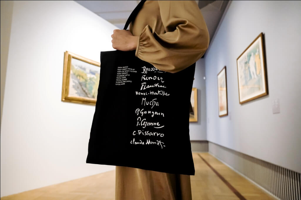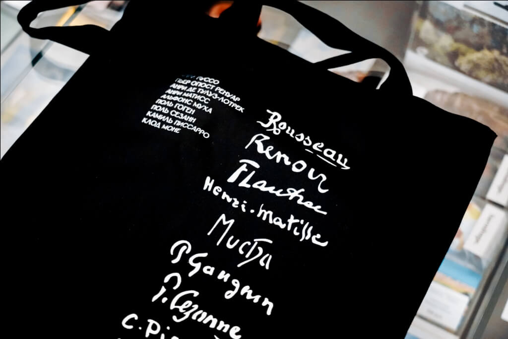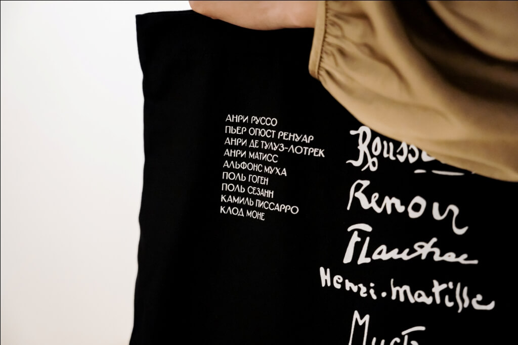 Черная сумка-шоппер с надписями и именами художников – Анри Руссо, Пьер Огюст Ренуар, Анри Тулуз-Лотрек, Анри Матисс, Альфонс Муха, Поль Гоген, Поль Сезанн, Камиль Писсарро и Клод Моне.