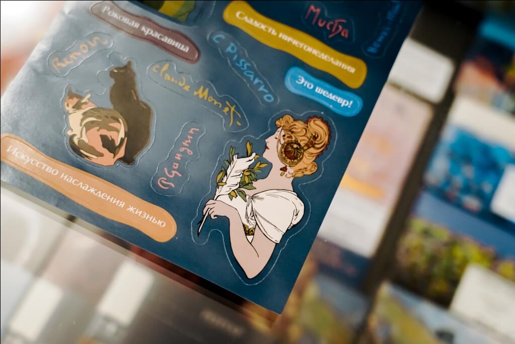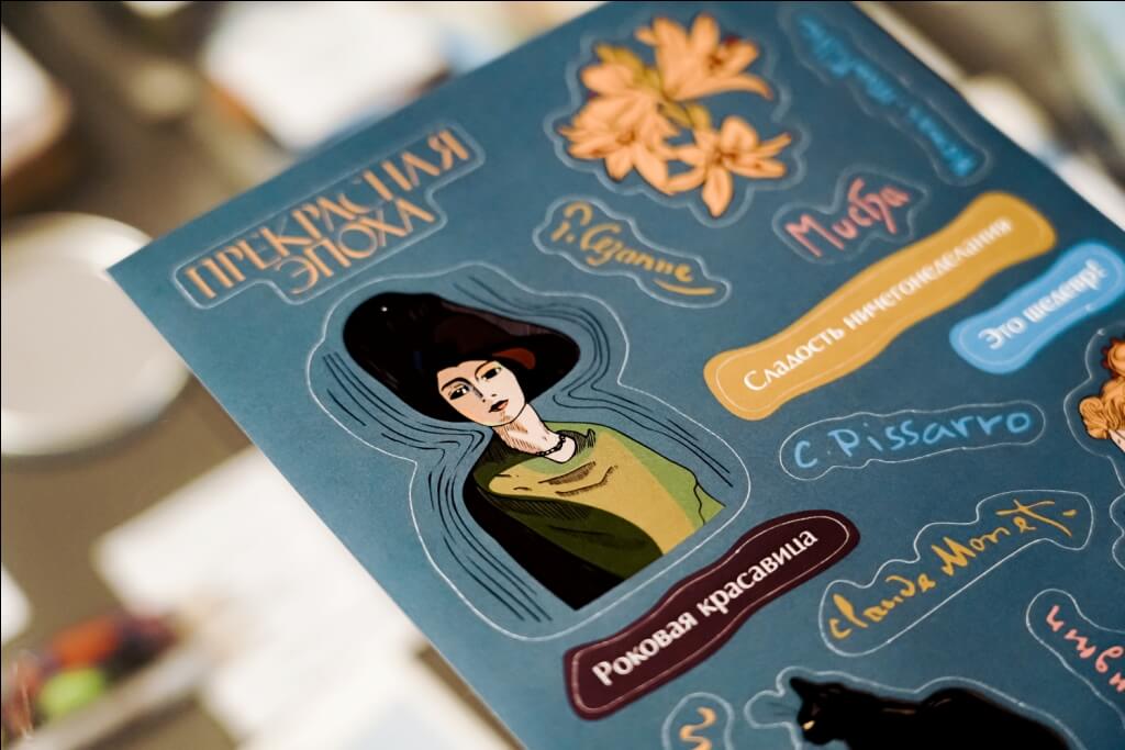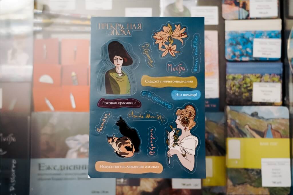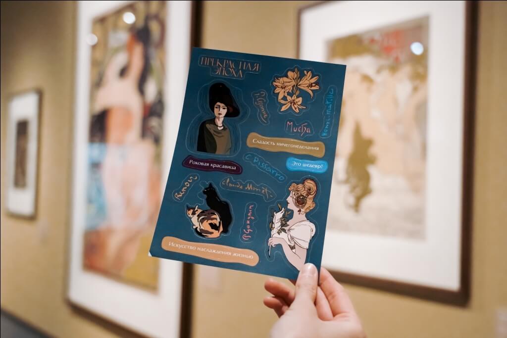 Наклейки с надписями – «Прекрасная эпоха», «Это шедевр!», «Сладость ничегонеделанья», «Искусство наслаждения жизнью», подписями художников и элементами, представленными на выставке.