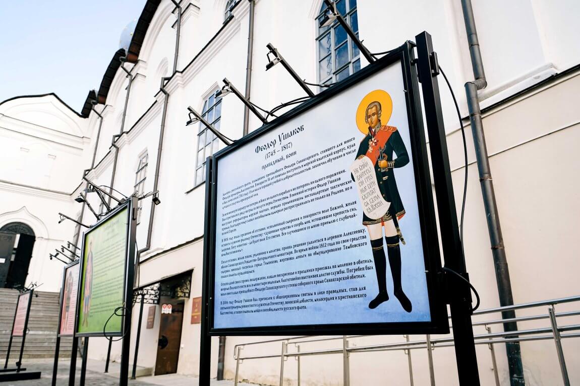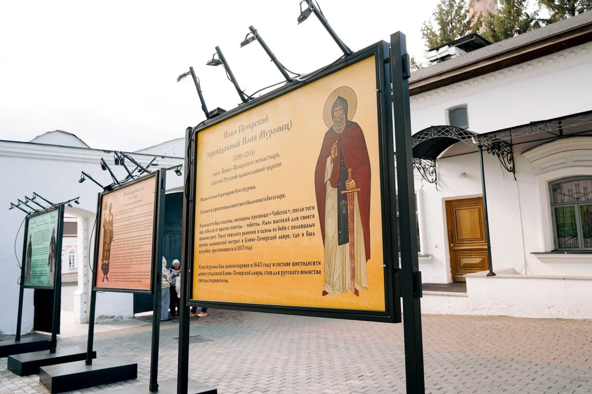 Во дворе Благовещенского собора открылась баннерная выставка «Вера и Меч: Святые воины России», приуроченная к 80-летию Победы в Великой Отечественной войне и году защитника Отечества в России.