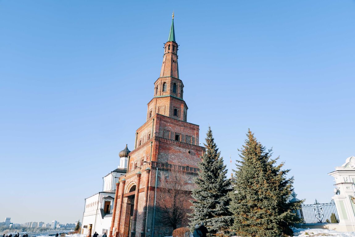 Башня Сююмбике возведена из большемерного, хорошо обожженного кирпича, занимает площадь 140 кв.м., состоит из 7 ярусов, а её общая высота достигает 58 метров. 3 нижних различных по высоте квадратных яруса имеют равносторонние квадратные контуры, окруженные по всему периметру открытыми галереями-гульбищами (терраса). Гульбища обнесены парапетами с ширинками на первом ярусе, поясами, выполненными поребриком (бордюр), на втором и третьем ярусах.